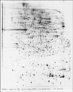 Proteome Factory bietet als Dienstleistung extrem hochauflösende zwei-dimensionale Gelelktrophorese (2DE) zur Trennung proteinhaltiger Proben an. Je nach Größe der 2DE Gele (8x7 cm, 23x30 cm, 40x30 cm oder 60x30 cm) können maximal bis zu 10000 Proteinspots in einem Molekulargewichtsbereich von ca. 8 bis 200 kDa und pI 3 bis max. 12 aufgetrennt werden.